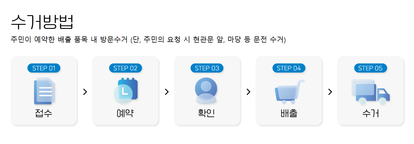 수거는 접수 후 예약, 확인, 배출, 수거의 단계로 진행됩니다.