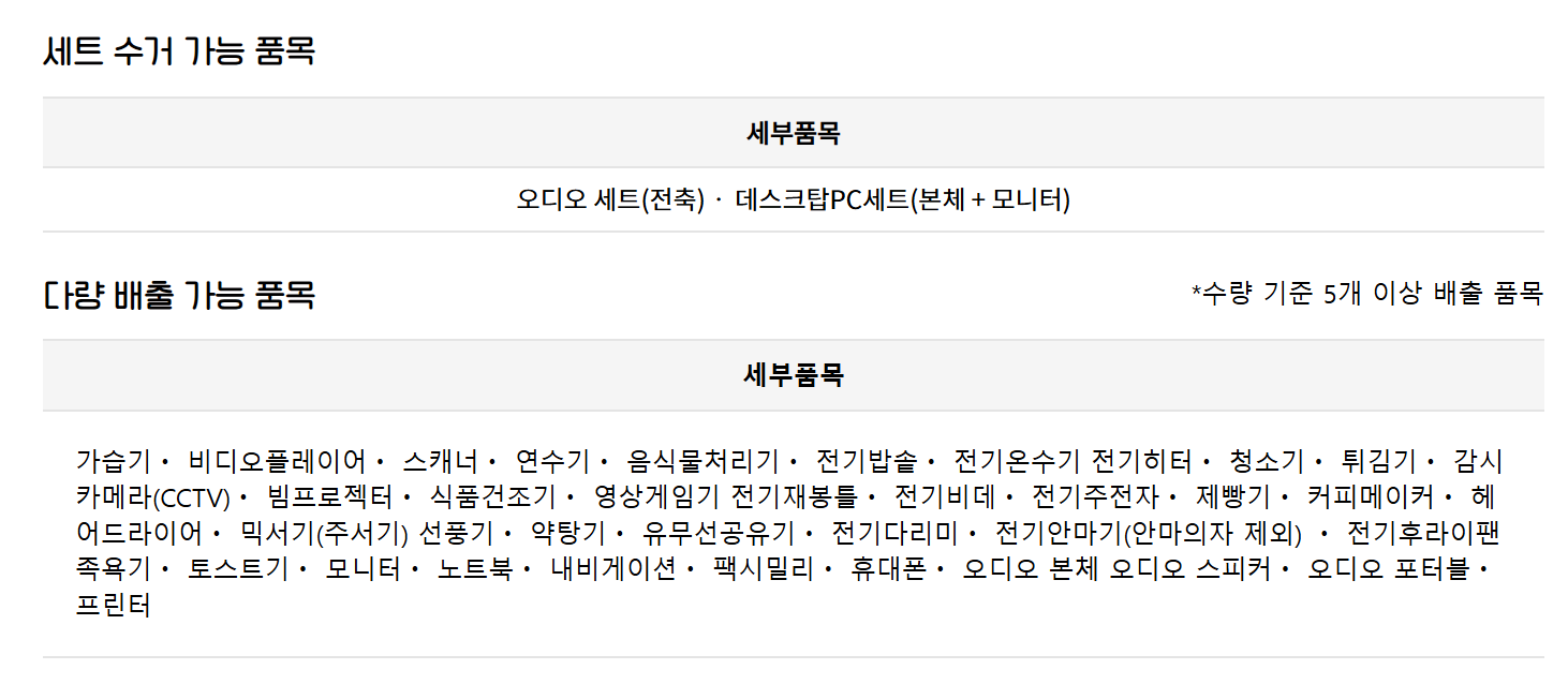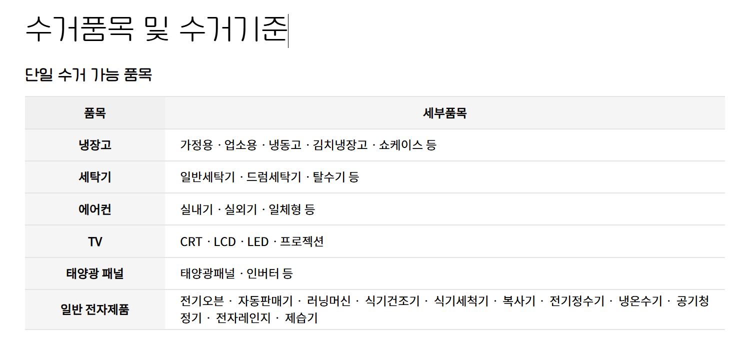 수거 신청 하기 전에 수거 가능한 목록과 수거 기준에 대해서도 꼼꼼하게 살펴보시길 바랍니다.